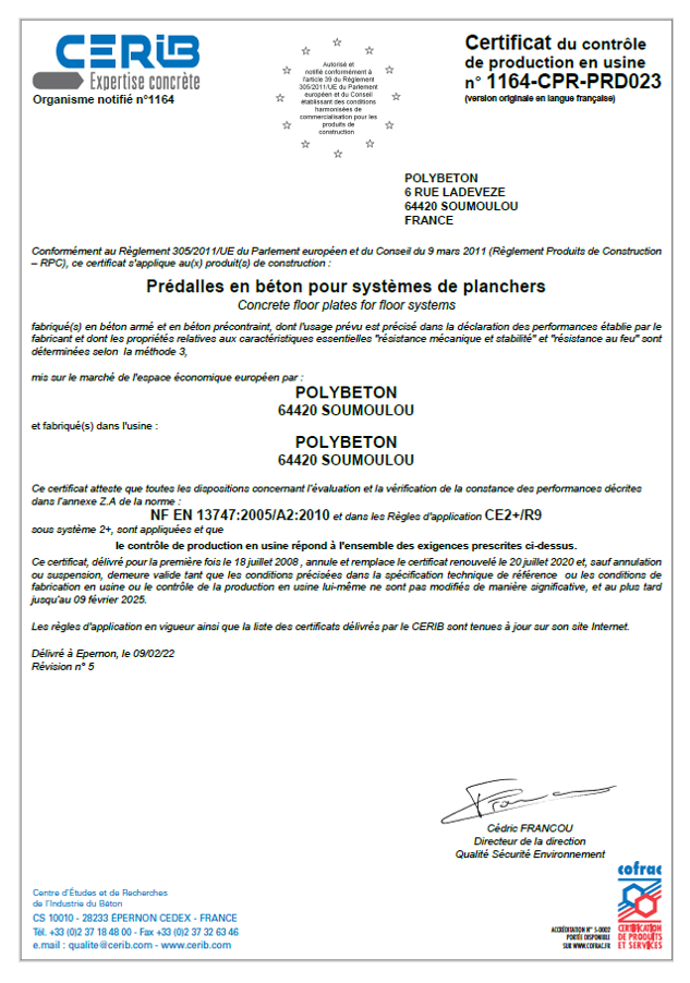 Nos produits sont conformes aux normes européennes NF EN13747 « Prédalles pour systèmes de planchers » et NF EN 13225 « Éléments de structure linéaires en béton armé et précontraint ».